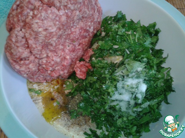 Соединить все ингредиенты с фаршем, добавить оливковое масло. Посолить.