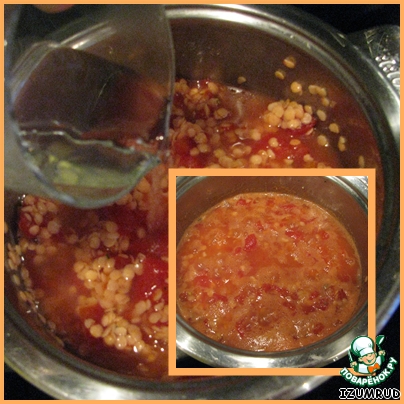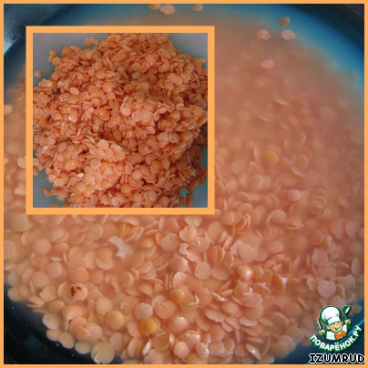 Чечевицу замочить на ночь.Откинуть на дуршлаг и дать стечь воде.