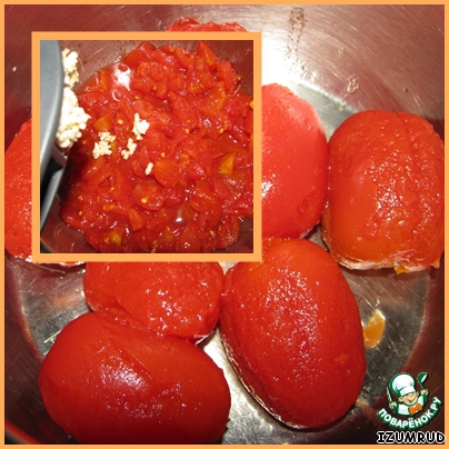 Помидоры очистить от кожицы,измельчить и выдавить к ним чеснок.