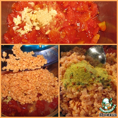 Добавить к помидорам мускатный орех и овощной кубик бульона.