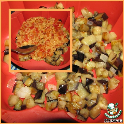 Пока вариться чечевица с помидорами обжариваем нарезанные кубиком баклажаны и мелко нарезанный лук.Обжариваем до золотистого цвета.