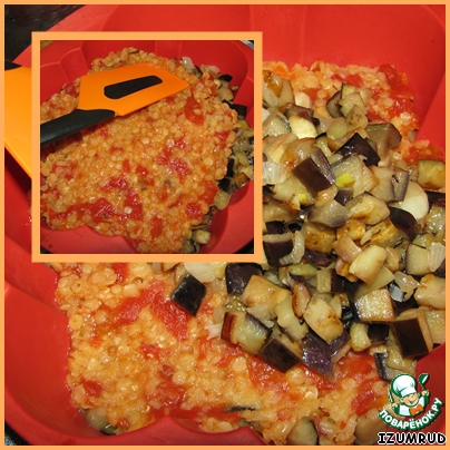 Нагреть духовку до 180 гр. В огнеупорную ёмкость выкладываем слоями баклажаны и чечевицу.