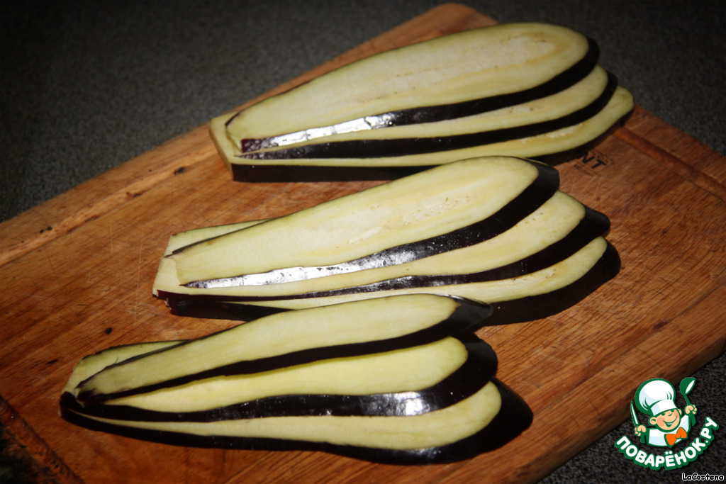 Нарезать баклажан так, чтобы получилось 3 столбика по 3 кусочка баклажана.