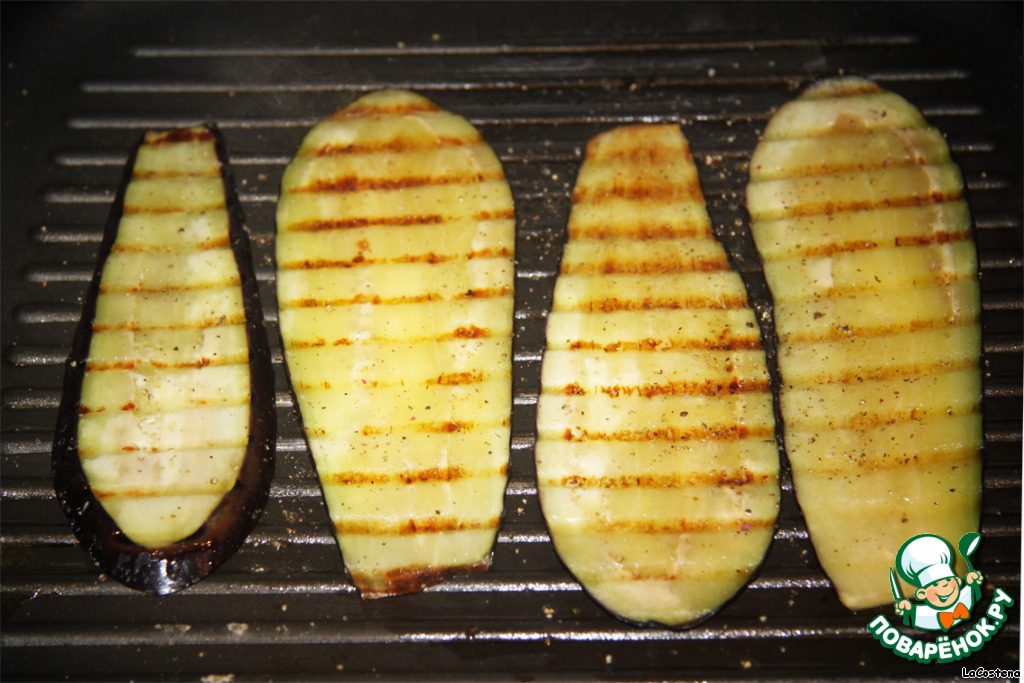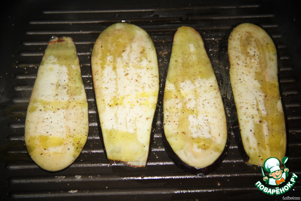 Разогреть сковородку-гриль, выложить баклажаны. Посолить и полить оливковым маслом.