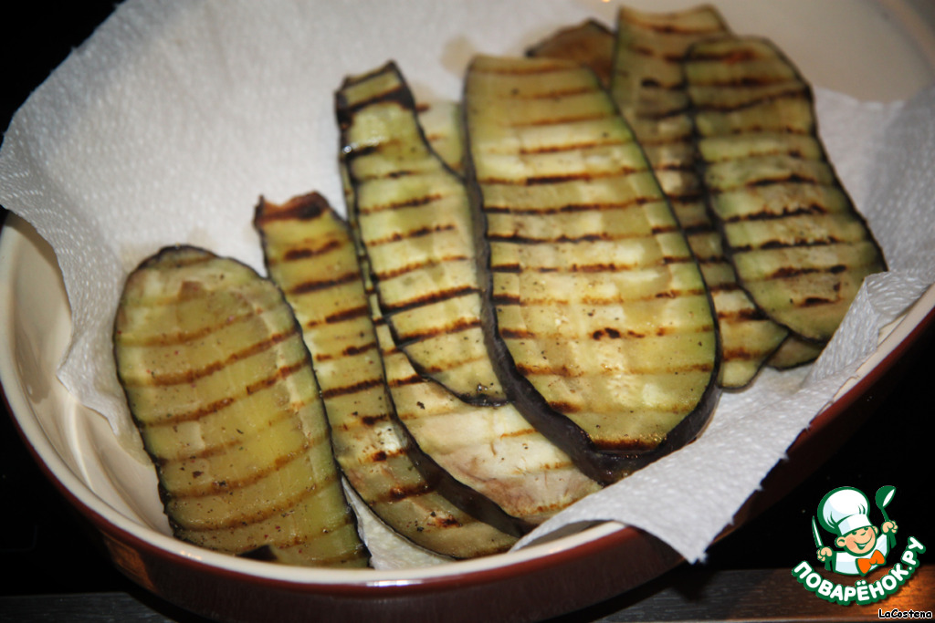 Выложить баклажаны на бумажное полотенце, чтобы убрать излишки масла.