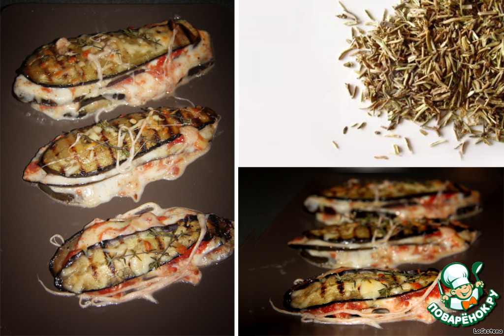 В форму выложить баклажаны, сверху кружки моцареллы и тимьян.