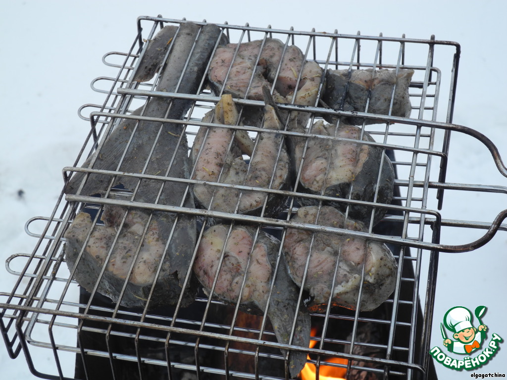 Выкладываем медальоны на решетку и идем к мангалу. Добиваться углей как для шашлыка не нужно, но и открытого огня делать не стоит. Нужно небольшое пламя, т.к. рыба жирная, и капельки жира стекают и подрумянивают медальон, делая аппетитную корочку. Время приготовления - на хорошем жаре около 25 минут.