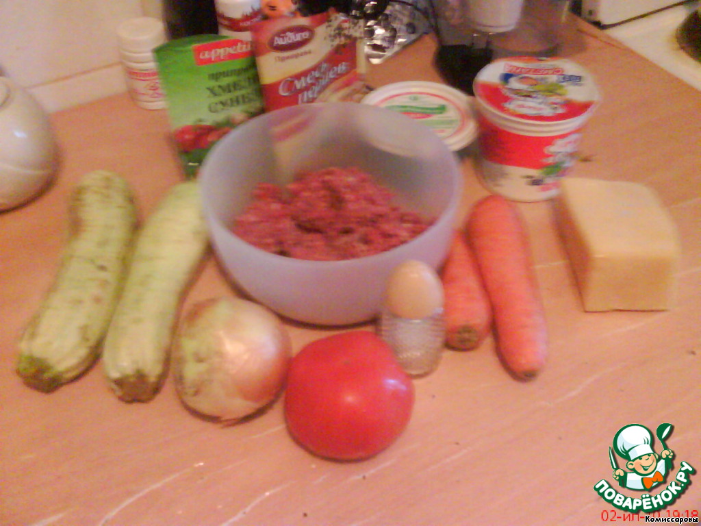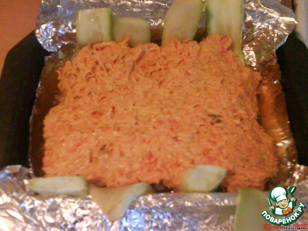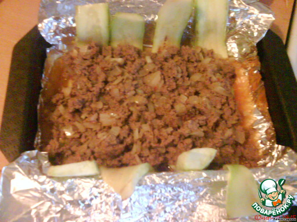 Форму для запекания застелить фольгой, выложить цукини, затем фарш.