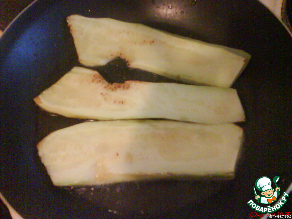 Цукини вымыть, порезать вдоль. Обжарить и посолить с двух сторон.