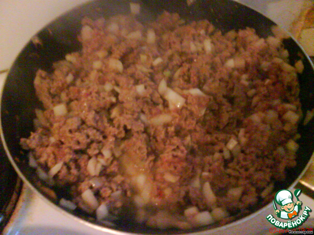 Обжарить смесь фарша и лука (фарш предварительно смешать с маринадом), потушить 5 минут под крышкой.