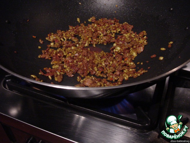 Вок или большую сковороду раскаляем и огонь не убираем. Все блюдо готовится очень быстро и при высокой температуре, поэтому очень важно постоянно мешать. В растительном масле поджариваем измельченный бекон.