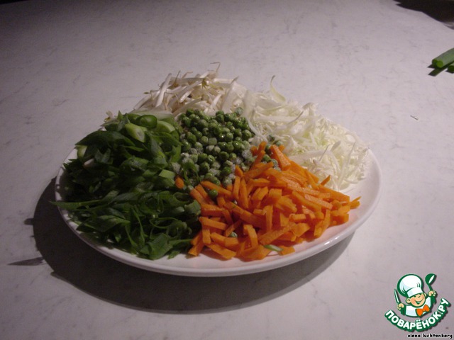 Подготавливаем овощи: капусту тоненько шинкуем, тонко нарезаем зеленый лук, морковку нарезаем соломкой.