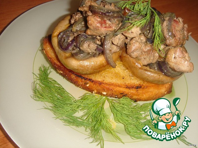 Разложите по порционным тарелкам. На каждую кусочек хлеба, сверху поджаренные шляпки грибов, на которые ложечкой аккуратно выложите печень. Полейте соусом от жарения.