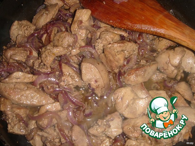 Жарьте печень 3-4 минуты, пока она не станет мягкой. Затем влейте 2 ст. ложки маринада и потушите 1 минуту. Посолите и поперчите.