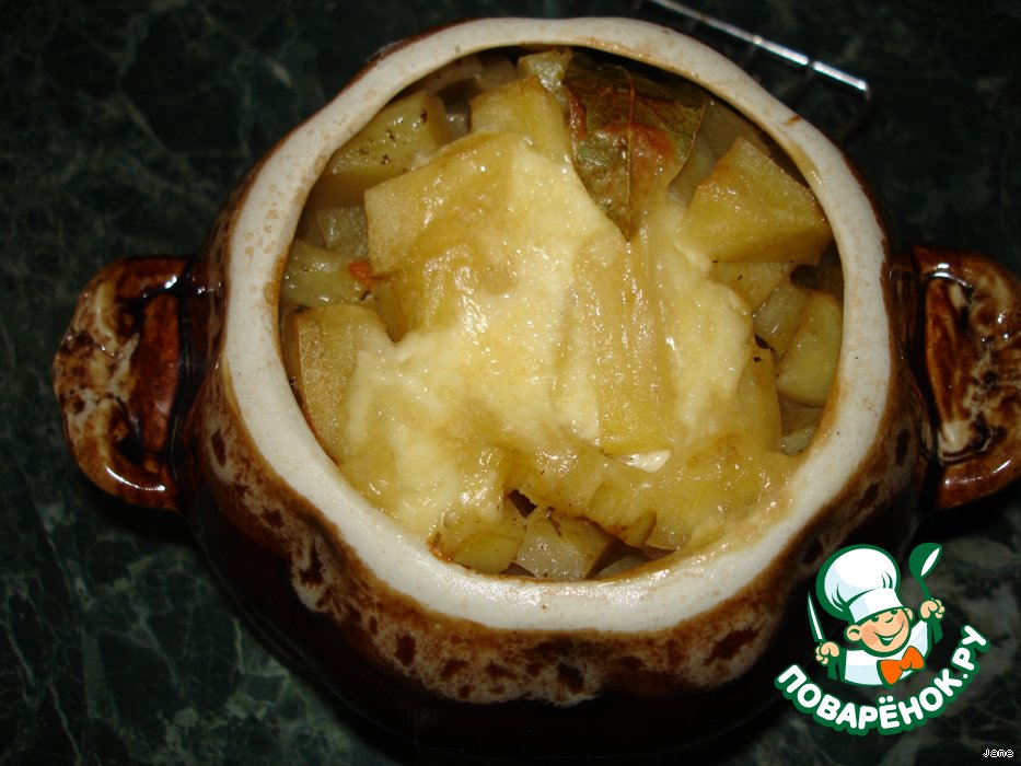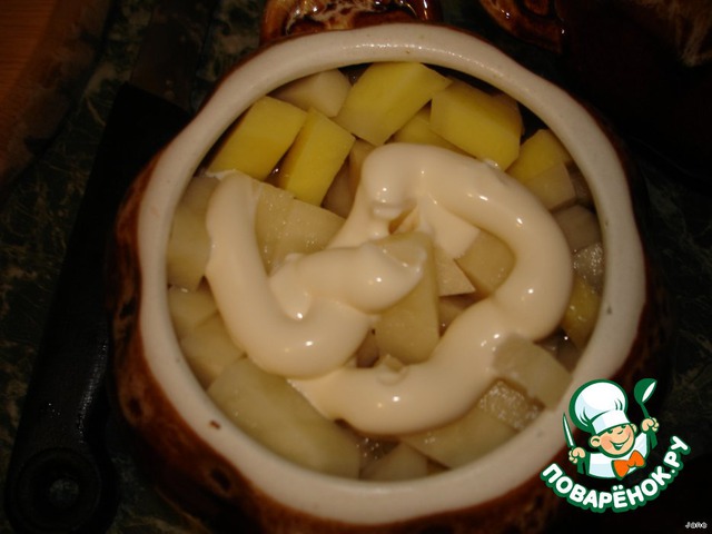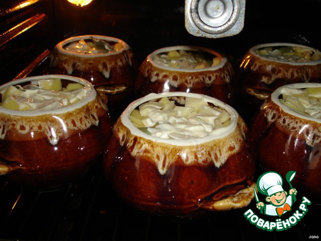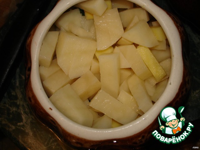 Сверху уложить порезанный кубиками картофель. Горшочки залить водой так, чтобы ее было видно через картошку, но не покрывала ее.
