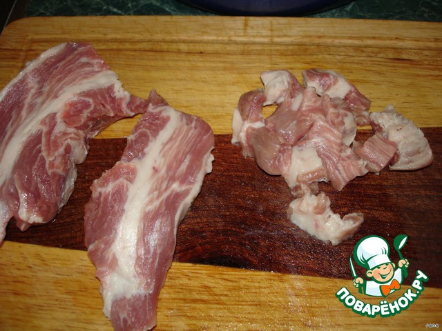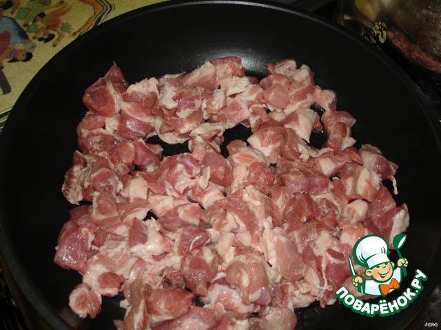 Мясо порезать на маленькие кусочки.