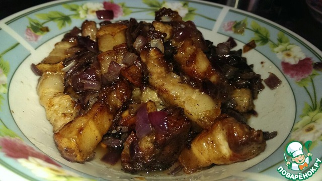 1) Для начала берем грудинку и режем средними кусочками. На разогретой сковороде обжариваем грудинку. Когда шкварки подрумянятся добавляем к ним 1 лук нарезанный кубиками. Все это томим до золотистого цвета лучка.