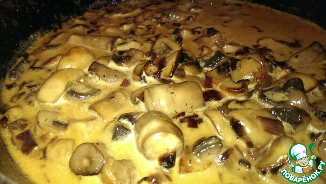 2)Грибы чистим. Если это лесные желательно перед жаркой их проварить. Я брала шампиньоны. Режем крупными кусочками. В сковороде греем подсолнечное масло и поджариваем 2 лука (лук можно резать как вам угодно). Когда лук подрумянится, добавляем грибы. Когда грибочки будут готовы, добавляем 2-3 ст. л. сметаны. Солим, перчим и тушим минут 5. По желанию можно добавить 2 зубчика чеснока.