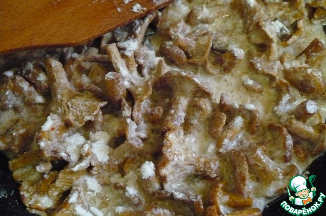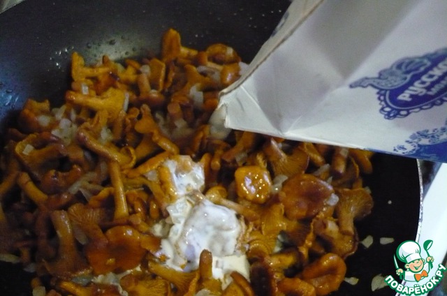Вареные лисички вылить в дуршлаг и дать слиться отвару. В сковородку налить 2 ст. л. масла, положить мелко нашинкованный лук и лисички. Обжарить 5 мин.