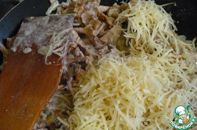 Добавляем тертый сыр и нарезанное филе. Все перемешиваем.