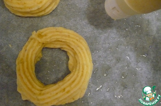 Теперь выкладываем его в корнетик и делаем кольца на противень, застеленный пергаментом и смазанный маслом.