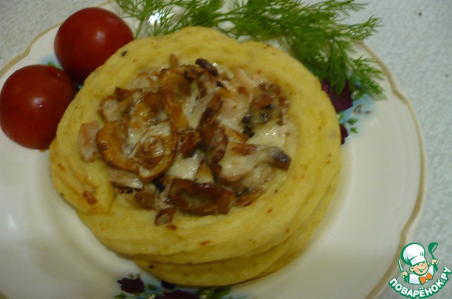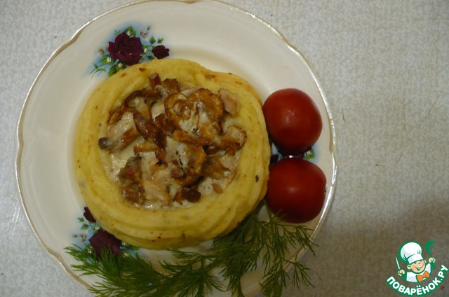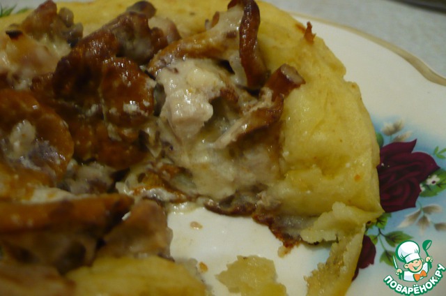 Переберем и промоем лисички. Отварим их в небольшом количестве воды, посолив,30 мин. За это время сварим картошку, помнем ее, слив всю воду и добавив 2 ст. л. масла. Оставим ее остывать. Здесь должна быть еще курица, но ее я добавила по ходу действия, поэтому на фото ее нет.