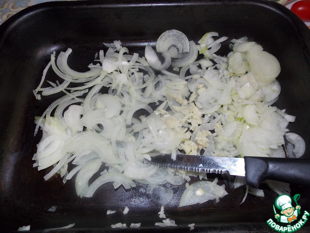 Начинаем лука..))Режим лук полукольцами а чеснок мелко нарезаем и ставим жарится минут на 5..