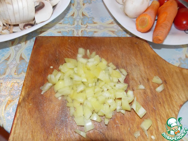 Пока жарится лук, режем перец.