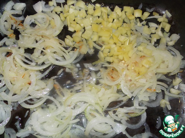 Добавляем перец к луку и тушим еще минуты 2..