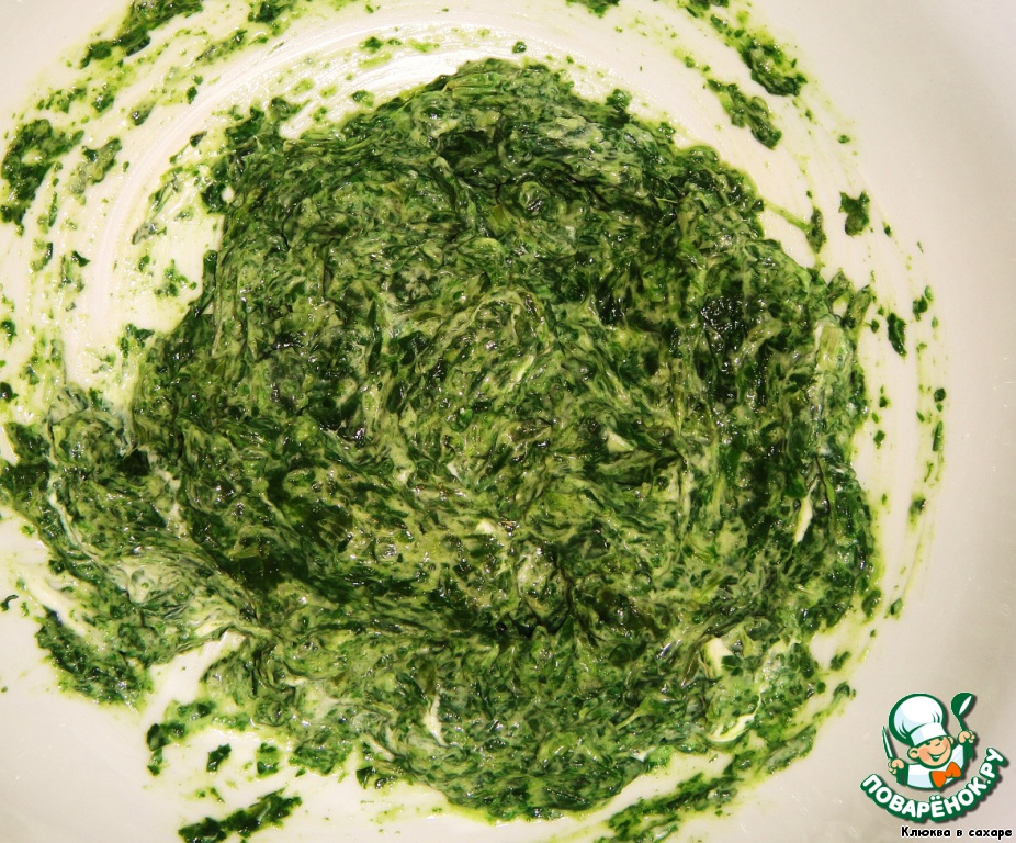 Перемешиваем лук со шпинатом и творожным сыром. Солим и перчим по вкусу.