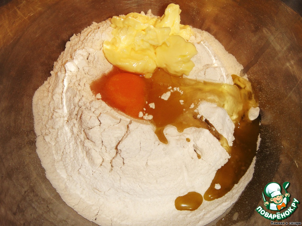 В глубокую миску просеиваем муку, добавляем к ней яйцо, растительное масло и размягчённое сливочное масло.