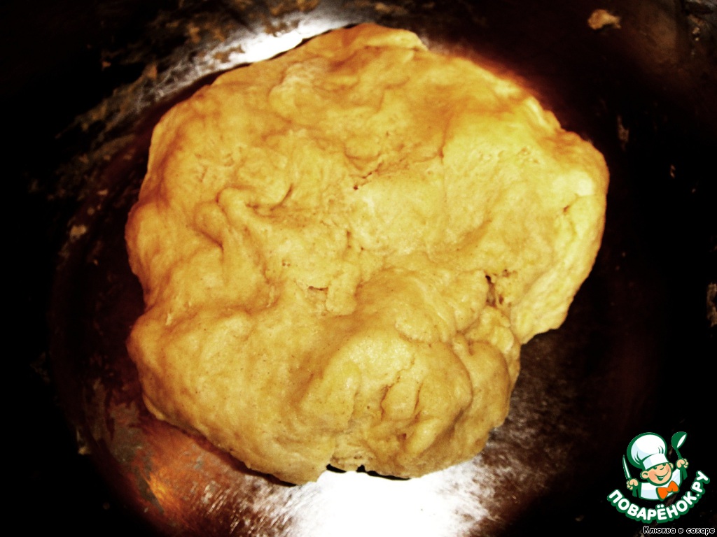 Замешиваем тесто, постепенно вливая в него тёплую подсоленную воду. Должна получиться тугая однородная масса.
