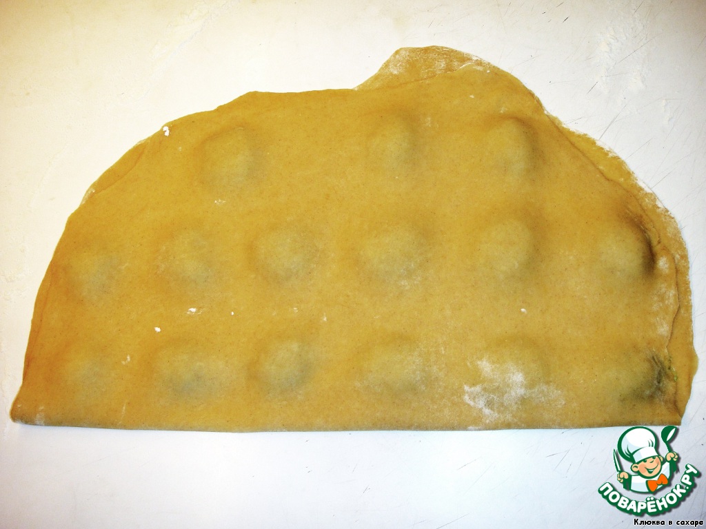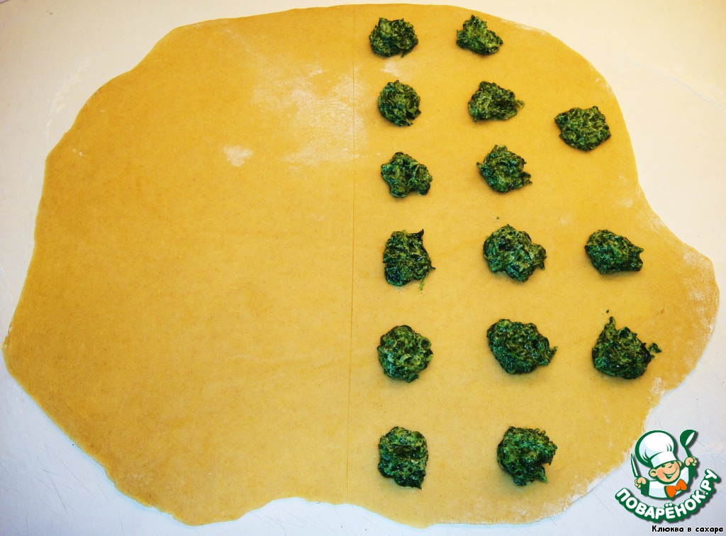 Раскатываем тесто пластом около 2 мм толщиной. Намечаем ножом центр пласта и на одну из половин выкладываем небольшими кучками приготовленный шпинатно-луковый фарш.