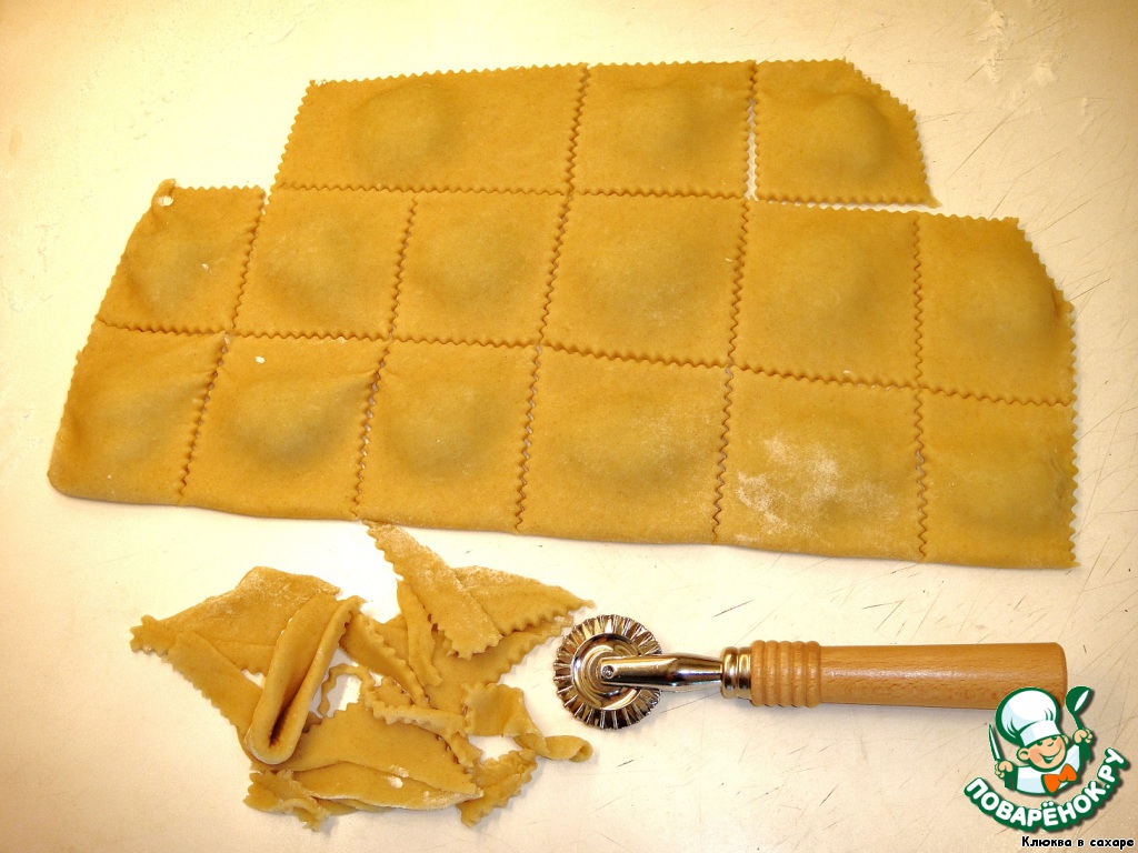Разрезаем на подушечки. Вовсе не обязательно, чтобы они были ровными, блюдо этого не требует. Обрезки теста не выкидывайте, они тоже пойдут в дело.