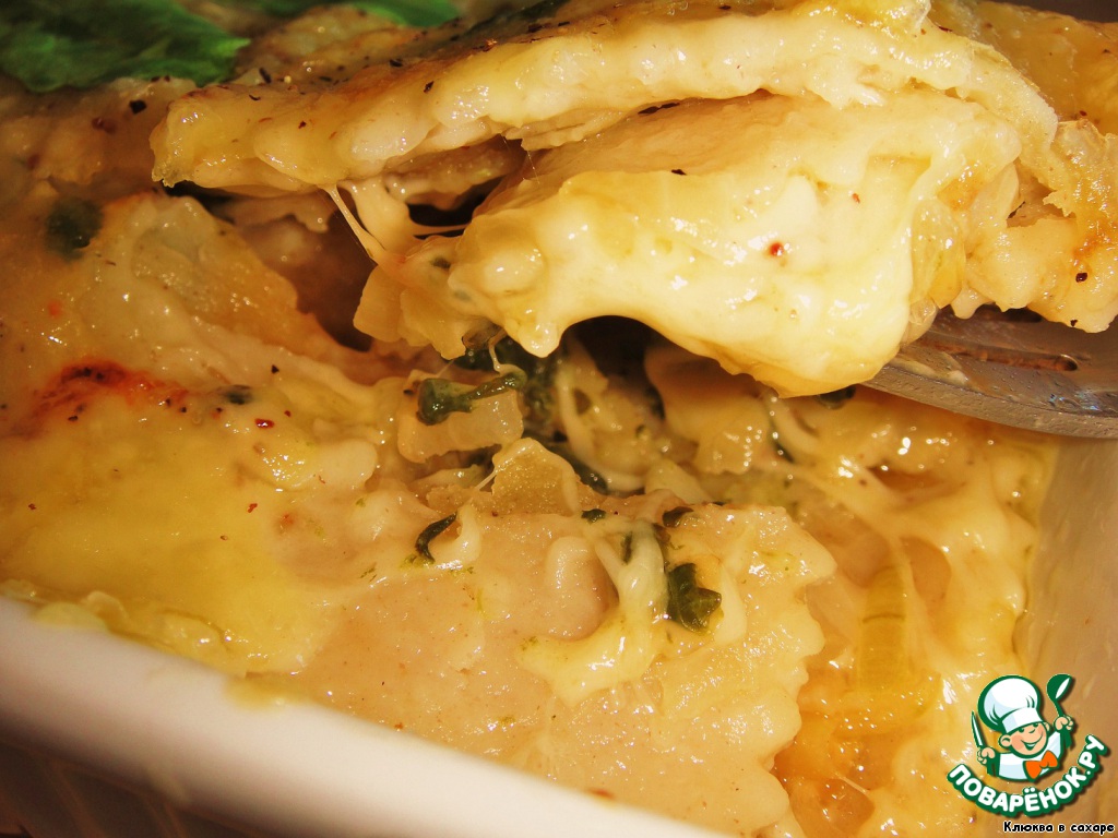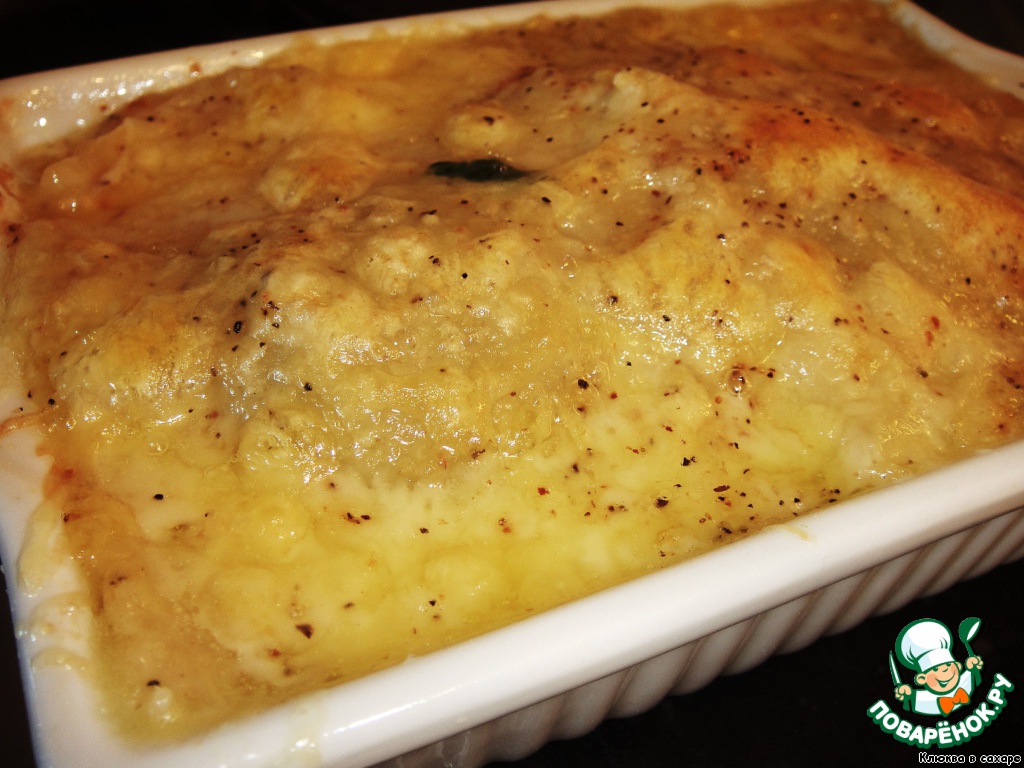 Вот так гратан выглядит изнутри: слои теста пропитываются расплавленным сыром, что делает блюдо сочным и удивительно аппетитным.