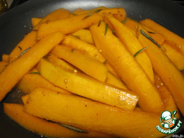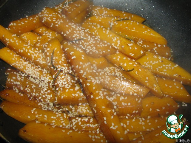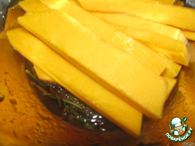 Через час, разогреваем сковородку. Выкладываем тыкву вместе с маринадом. Сначала тыква тушится, потом, когда маринад выпарится, нужно слегка обжарить со всех сторон.