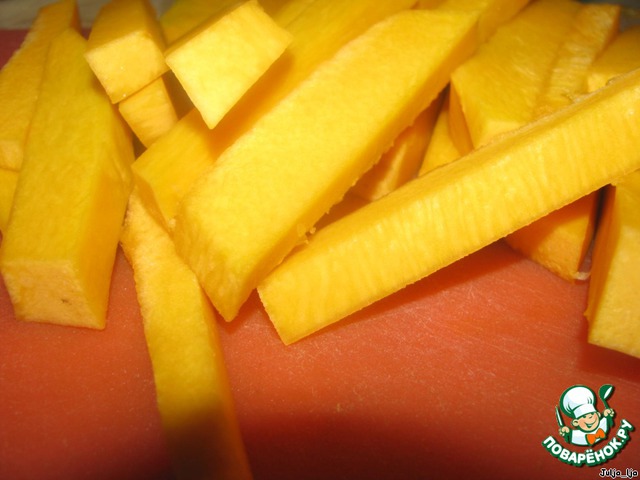 Тыкву нарезаем довольно толстыми и длинными полосками (вообще нарезка может быть произвольная, мне захотелось так).