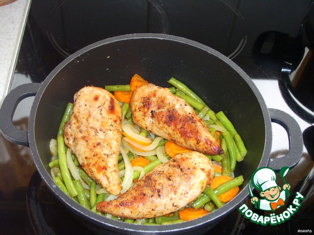 Кладем грудки сверху и тушим до готовности. Получается очень вкусно и сочно!