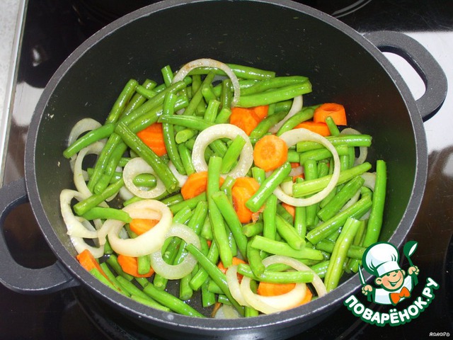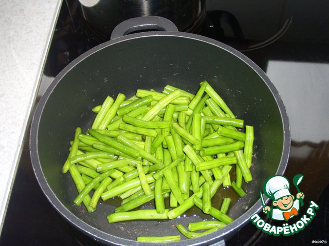 Стручковую фасоль промываем, режем пополам и слегка тушим в оливковом масле