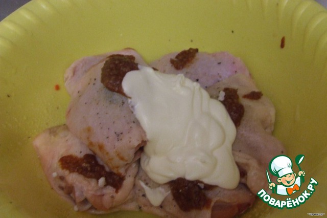 Теперь принимаемся за куриные бедрышки. Их надо посолить, поперчить, смазать майонезом и аджикой и оставить для маринования примерно на 10-15 минут.
