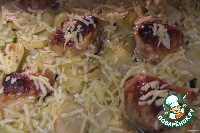 Картофель с куриными бедрышками, запечeнный в духовке