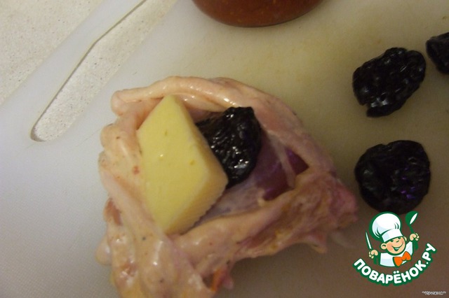 После того, как наши бедрышки замаринуются, мы их должны зафаршировать - это и будет наша изюминка. В бедрышки, аккуратно отсоединив с одного края шкурку, кладём чернослив и пластик сыра.