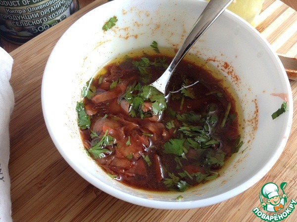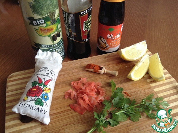 Смешиваем соевый соус, оливковое масло, зелень кинзы, нарезанный маринованный имбирь, раздавленный зубчик чеснока, лимонный сок, паприку. Пробуем на свой вкус. Мне захотелось добавить сладкого вкуса и я налила устричный соус, если у вас его нет, добавьте коричневый сахар - пол чайной ложечки, но это не обязательно, может на ваш вкус будет всего достаточно.