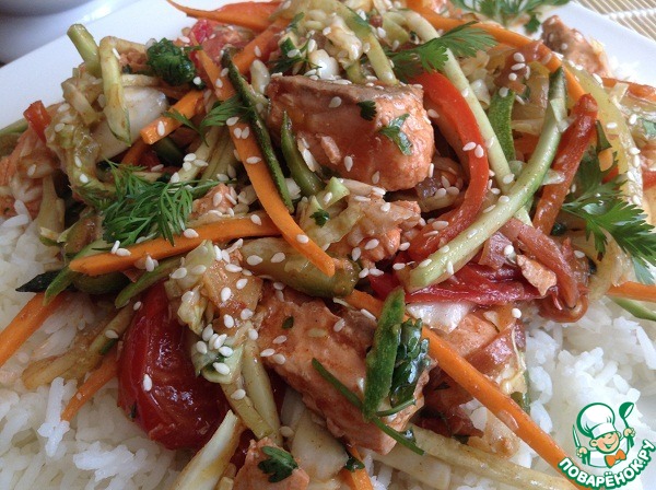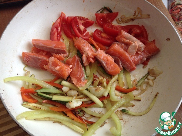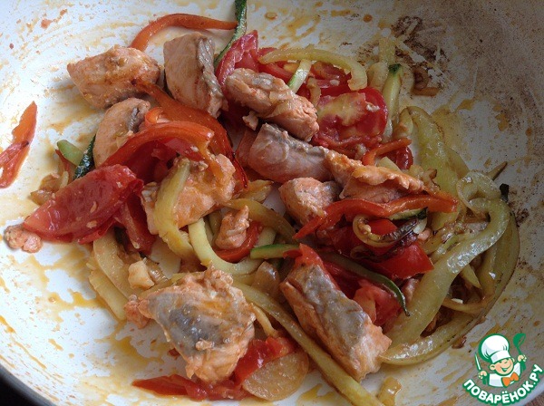 На растительном масле обжариваем овощи, добавляем рыбу.
