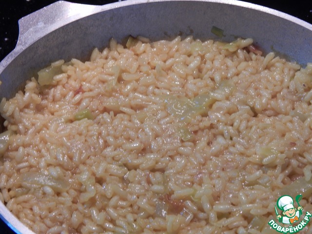 В сковороду к обжаренному луку и перцу выкладываем рис слоем приблизительно 1,5 см, вливаем бульонную смесь, не перемешивая, тушим на слабом огне 15 минут.