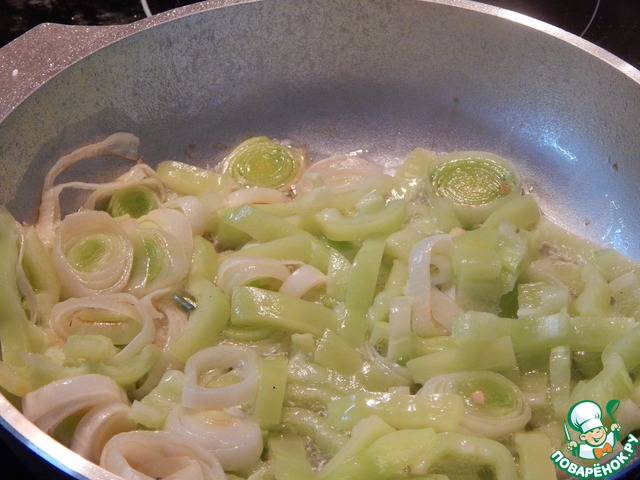 Оставшееся оливковое масло выливаем на раскаленную сковороду, добавляем порезанный лук-порей и сладкий перец, солим и обжариваем в течении 5 минут.