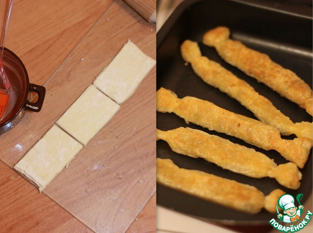 Пока охлаждается начинка, подготовьте тесто. Раскатайте листы теста. Нарежьте на прямоугольники, выложите начинку, оставляя края пустыми, как у конфеты. Скатайте в виде цилиндра и защипните края. Чтобы тесто хорошо слипалось, смазывайте его растопленным сливочным маслом во время работы. Выложите хлопушки на смазанный маслом противень. Выпекайте при 170°С пока тесто не станет золотистого цвета. Советую раскатывать тесто, как можно тоньше и не делать слишком большие прямоугольники. Иначе задумка в виде небольших хлопушек не выйдет. Тесто под воздействием температуры печи расплывется. Для сравнения - на данном фото хлопушки большого размера. Они такие же вкусные, но большие, готовый результат правда не успела заснять.. Пока готовила вторую партию хлопушек - первая бесследно исчезла.