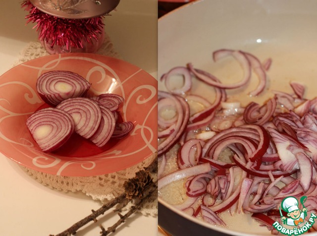 Растительное масло разогрейте в сковороде и обжарьте, нарезанный полукольцами лук до золотистого цвета.