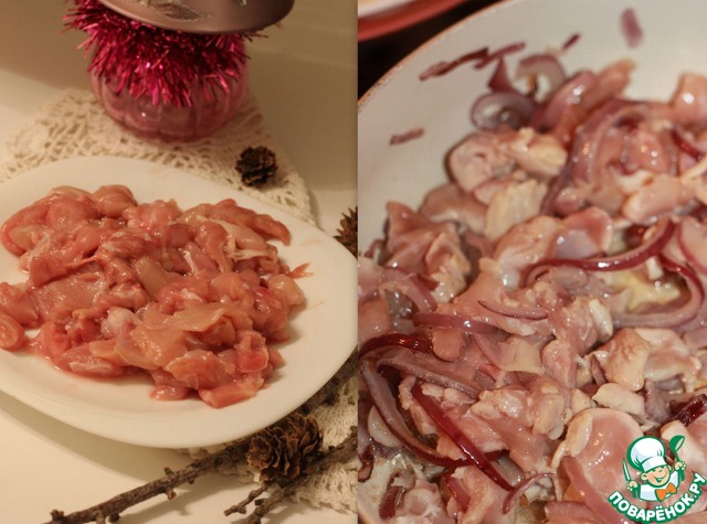 Теперь необходимо добавить мелко нарезанное куриное филе. И продолжать готовить минут 5, пока мясо не приобретет золотистую корочку.