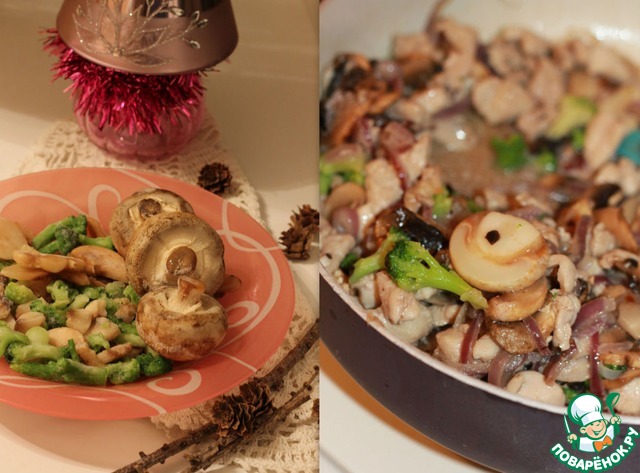 К курице с луком добавить нарезанные пластинками шампиньоны и тонкие стебли брокколи. Я использовала замороженные.
